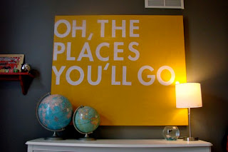 The "Oh The Places You'll Go" painting on her Pinterest page is so super cute. Ours didn't quite turn out how we intended, but our lack of patience got the best of us and we decided to just free-hand it.